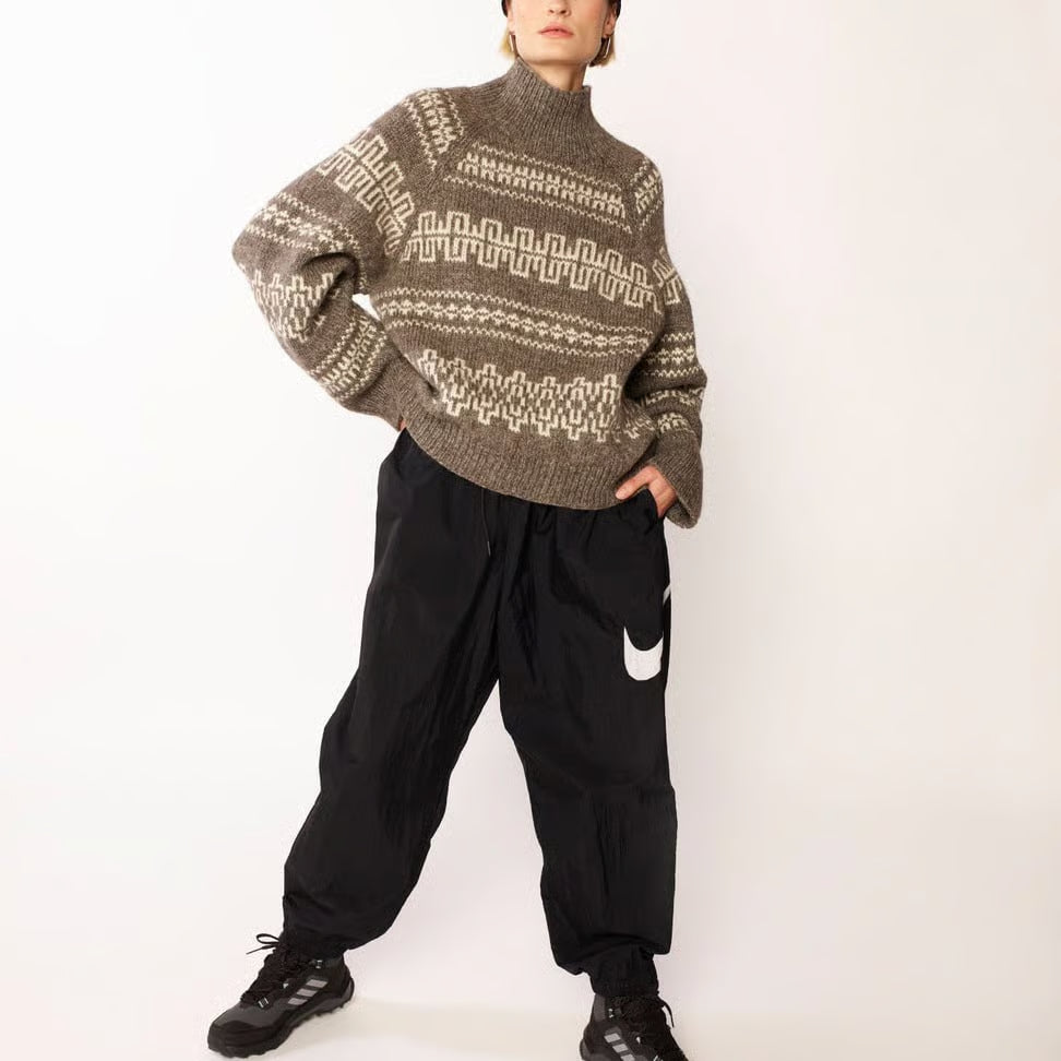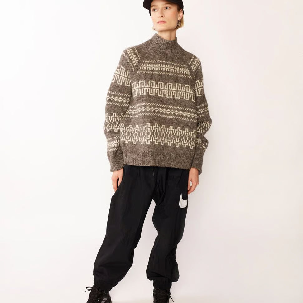 Der Fjære Pullover wird zweifarbig gemustert gestrickt. Er hat eine legere, oversized Passform mit Raglankonstruktion der Passe, rundem Halsausschnitt und Bündchen im Rippenmuster. Gestrickt wird der Pullover von oben nach unten. Der Nackenbereich wird mit verkürzten Reihen geformt. Für die Raglankonstruktion werden beidseitig der drei Raglanmaschen Zunahmen gearbeitet. Für eine oversized Passform sollte eine Größe gewählt werden, die einen Brustumfang von 20–28 cm mehr hat als der eigene Körpermaß.