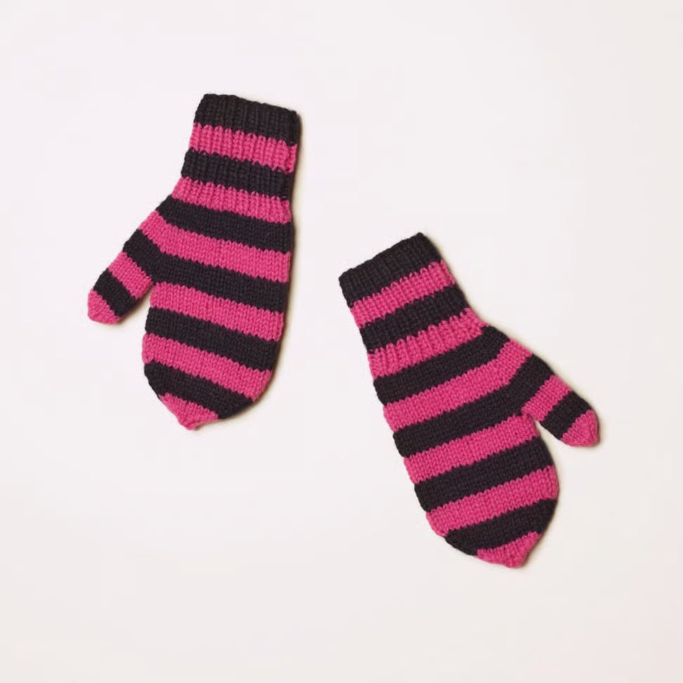 Die gestreiften Fäustlinge werden glatt rechts gestrickt. Sie haben einen Daumenkeil und eine gerippte Manschette. Der Daumenzwickel wird durch Zunahmen zwischen zwei Markierern geformt, und die Spitze des Fäustlings und des Daumens wird durch Abnahmen gestaltet.