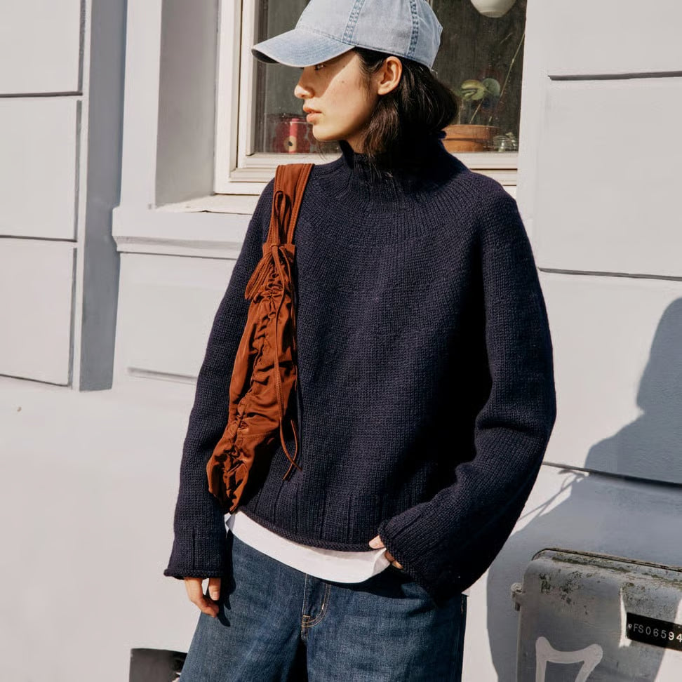 Der Heia Rundgenser ist ein einfach zu strickender Pullover mit Rundpasse und geraden, weiten Ärmeln. Der Kragen, Körper und Ärmel weisen ein breites Bündchen auf, das mit einer kleinen Rollkante abschließt. Der Pullover wird von oben nach unten in Runden gestrickt. Zuerst wird der Halsausschnitt im Rippenmuster gearbeitet. Anschließend wird die Passe glatt rechts mit Zunahmerunden gestrickt, bis die sie den gewünschten Umfang erreicht hat. Dann wird die Arbeit geteilt, und die Ärmelmaschen werden stillgelegt. Unter den Armen werden Maschen angeschlagen, und der Rumpf wird weiter in Runden gestrickt. Er endet mit dem gleichen Rippenmuster wie am Halsausschnitt. Zum Schluss werden die Ärmelmaschen wieder aufgenommen, jeder Ärmel wird in Runden gestrickt und ebenfalls mit dem Rippenbündchen abgeschlossen.
