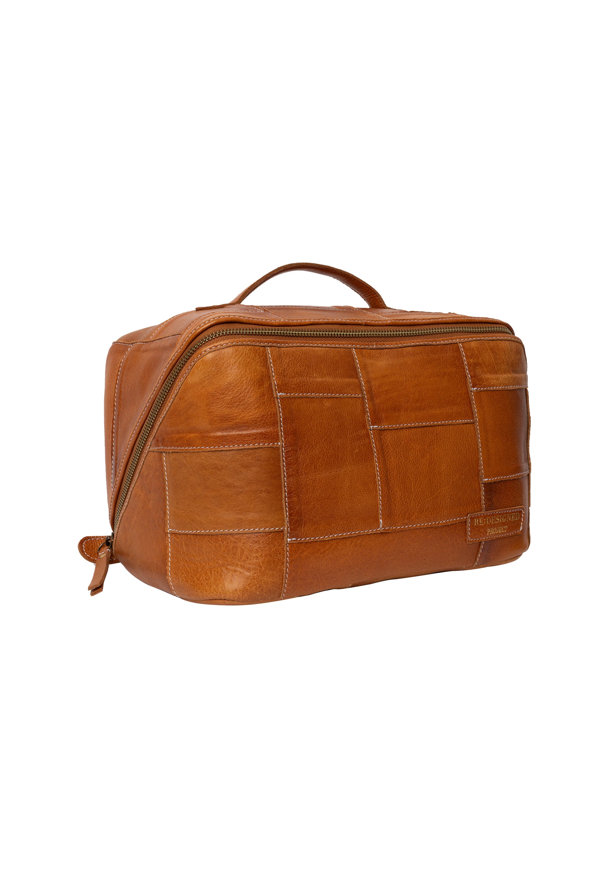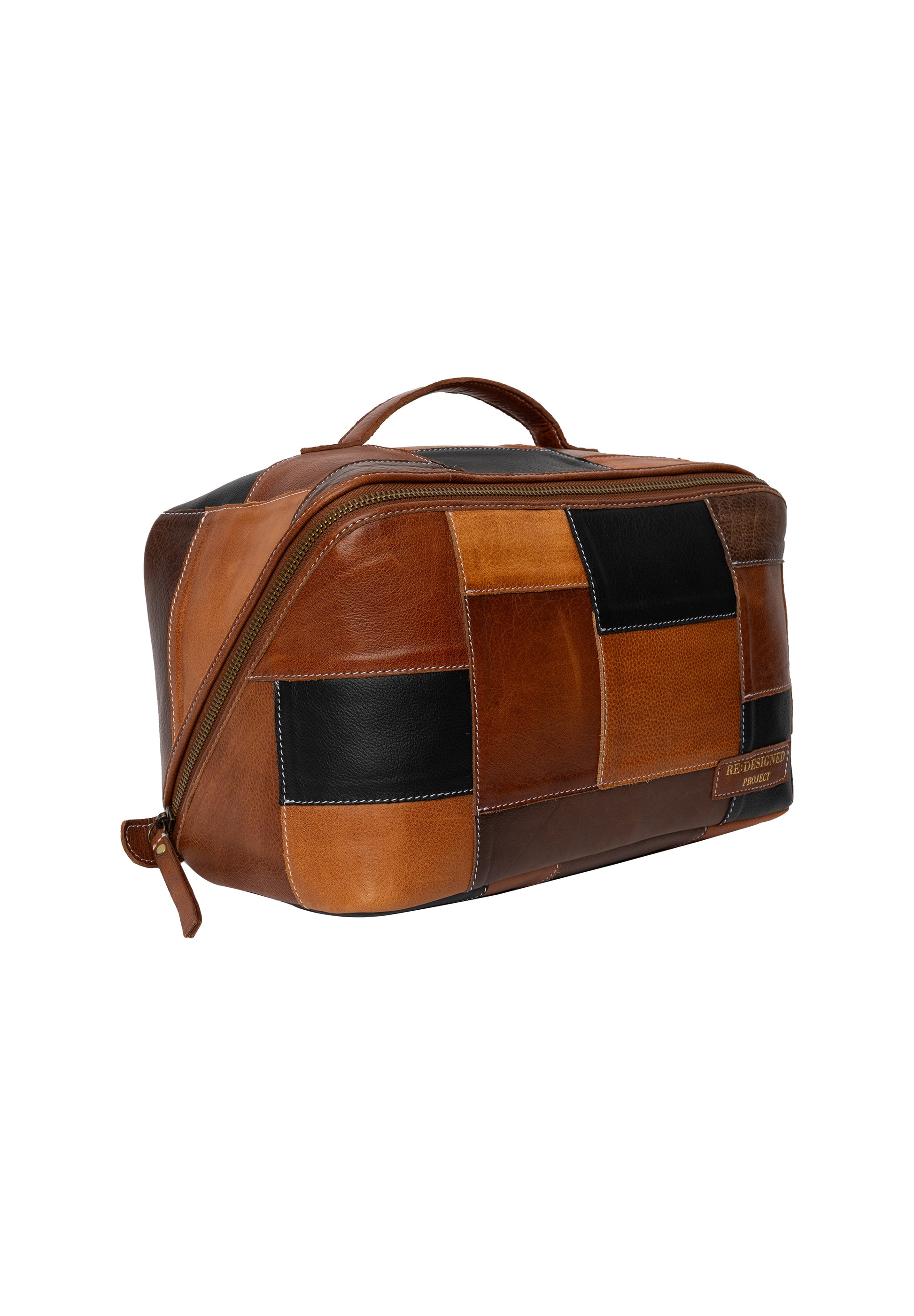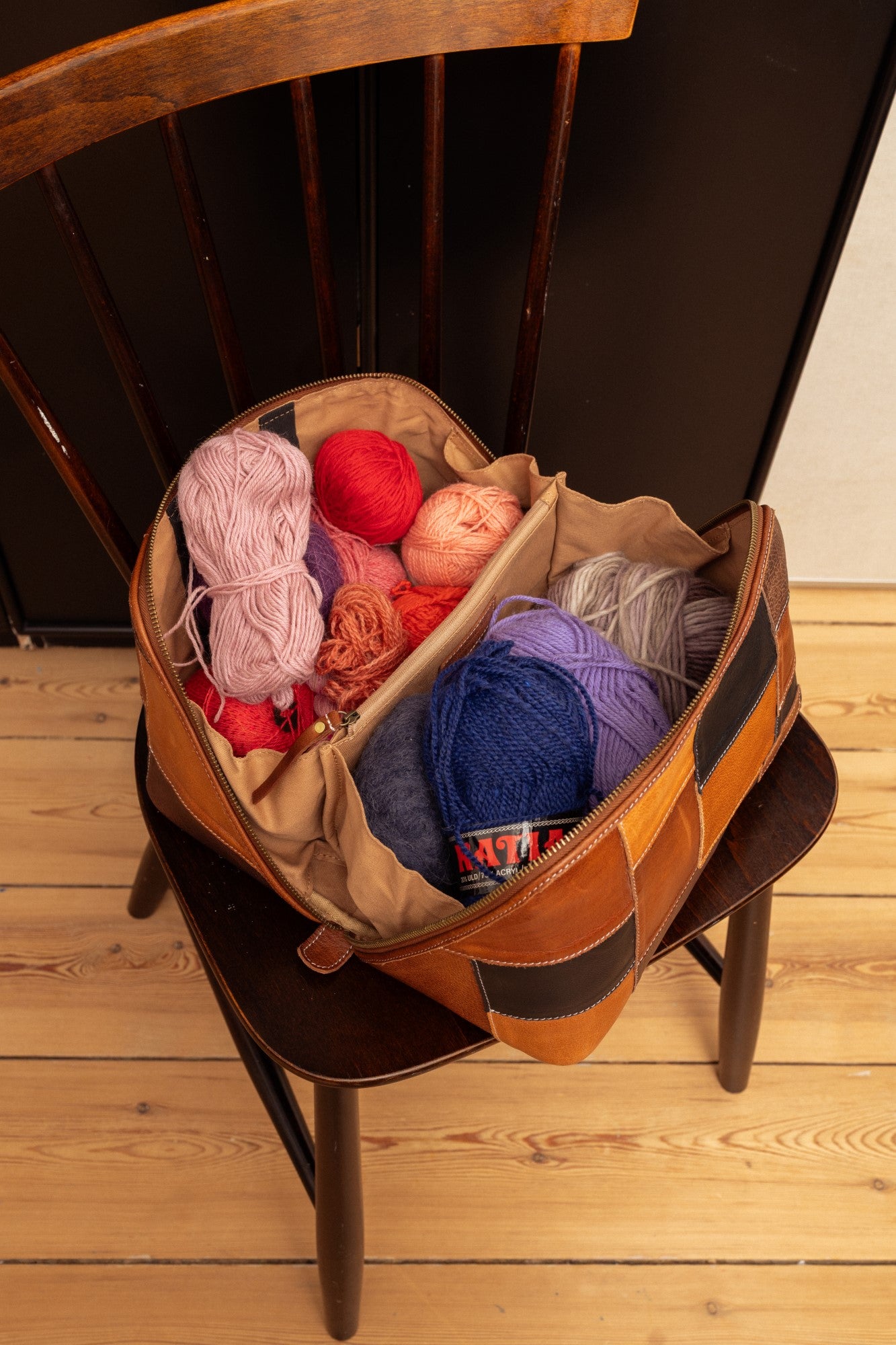 Die Außenseite der Tasche ist im Patchworkstil kreiert, um die bei Lederbearbeitung entstehenden Lederreste zu minimieren, indem verschiedenste Stücke von zerrissenem oder zugeschnittenem Leder wiederverwendet und zu neuem Leben erweckt werden. Die Reststücke werden in kleine Quadrate geschnitten und sorgfältig zusammengenäht – so entsteht eine einzigartige und wunderschöne Projekttasche, bei der keine Tasche der anderen gleicht.