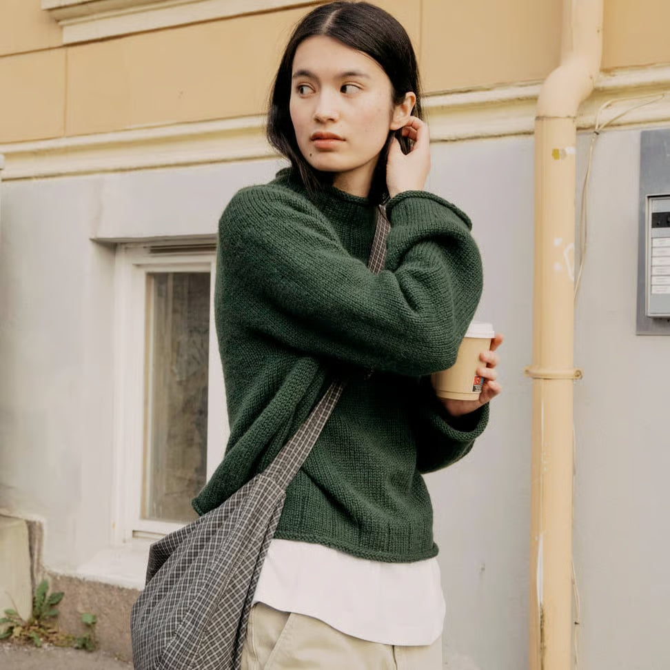 Strickset zum eigenständigen Stricken des auf dem Foto abgebildeten Pullovers von Rauma Garn, bestehend aus: